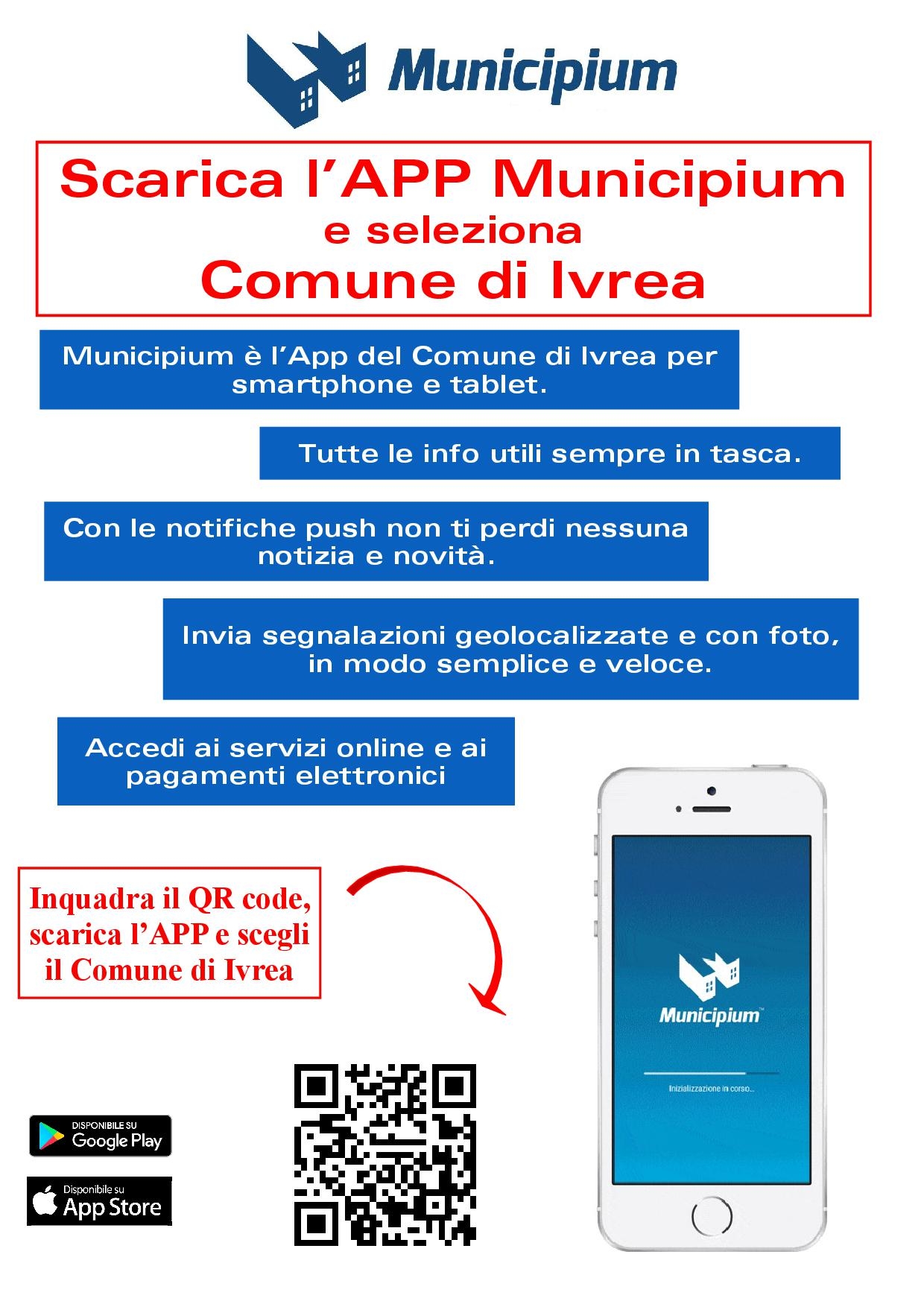 E' disponibile per i cittadini del Comune di Ivrea il nuovo servizio App Municipium, che si affianca ai canali di comunicazione dell'Ente già esistenti (sito web ufficiale, Newsletter, pagina Facebook e Twitter) e sostituisce l'App Cittadino Digitale, utilizzata fino ad ora.