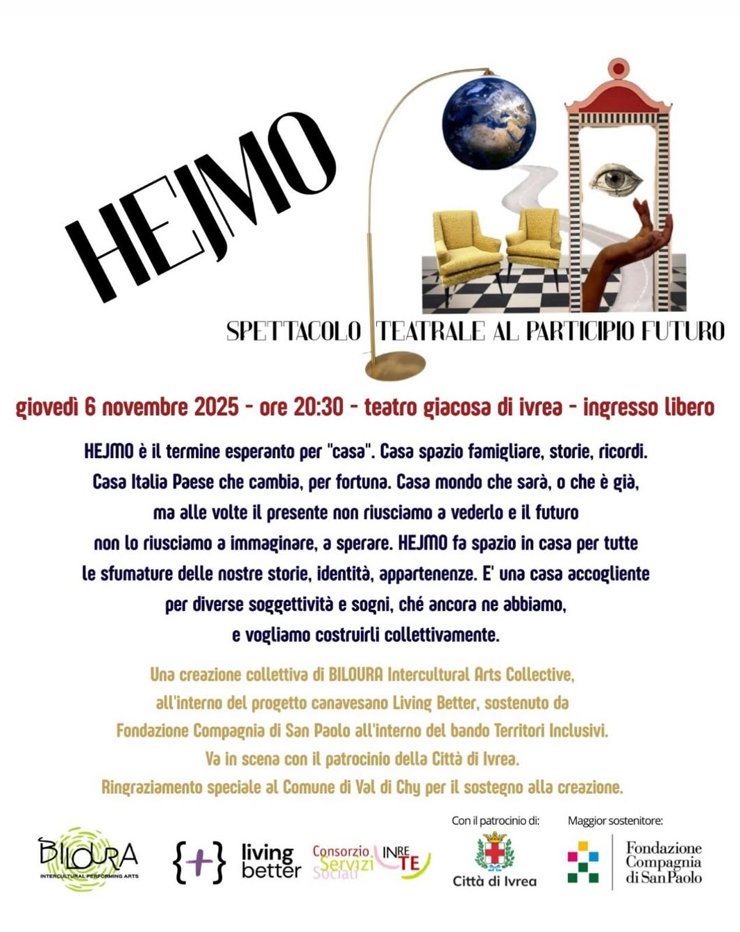 Cos'è? Hejmo - spettacolo teatrale al participio futuro.Giovedì 6 novembre ore 20:30 al Teatro Giacosa di IvreaIngresso libero.