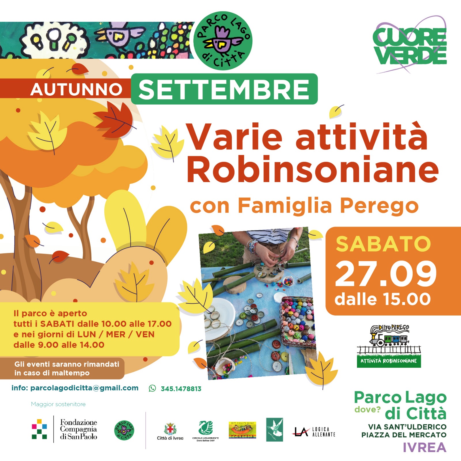 Cos'è? Sabato 27 settembre dalle 15:00 al Parco Lago di Città Varie attività Robinsoniane con famiglia Perego.L'evento sarà rimandato in caso di maltempo.