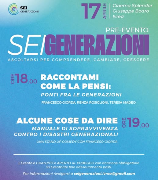 Venerdì 17 aprile presso il Cinema Boaro Splendor si terrà la presentazione di “SEI GENERAZIONI”, un evento promosso dall’Associazione Cometa in collaborazione con diverse realtà cittadine e patrocinato dal Comune di Ivrea, che culminerà nella giornata di domenica 10 maggio