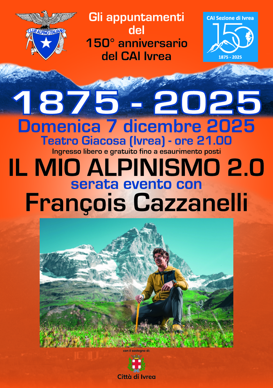 Nell'ambito degli appuntamenti per i 150 anni del CAI Ivrea domenica 7 dicembre alle 21:00 al Teatro Giacosa serata evento con François Cazzanelli guida alpina, soccorritore ed alpinista di fama internazionale con “Il mio alpinismo 2.0”.