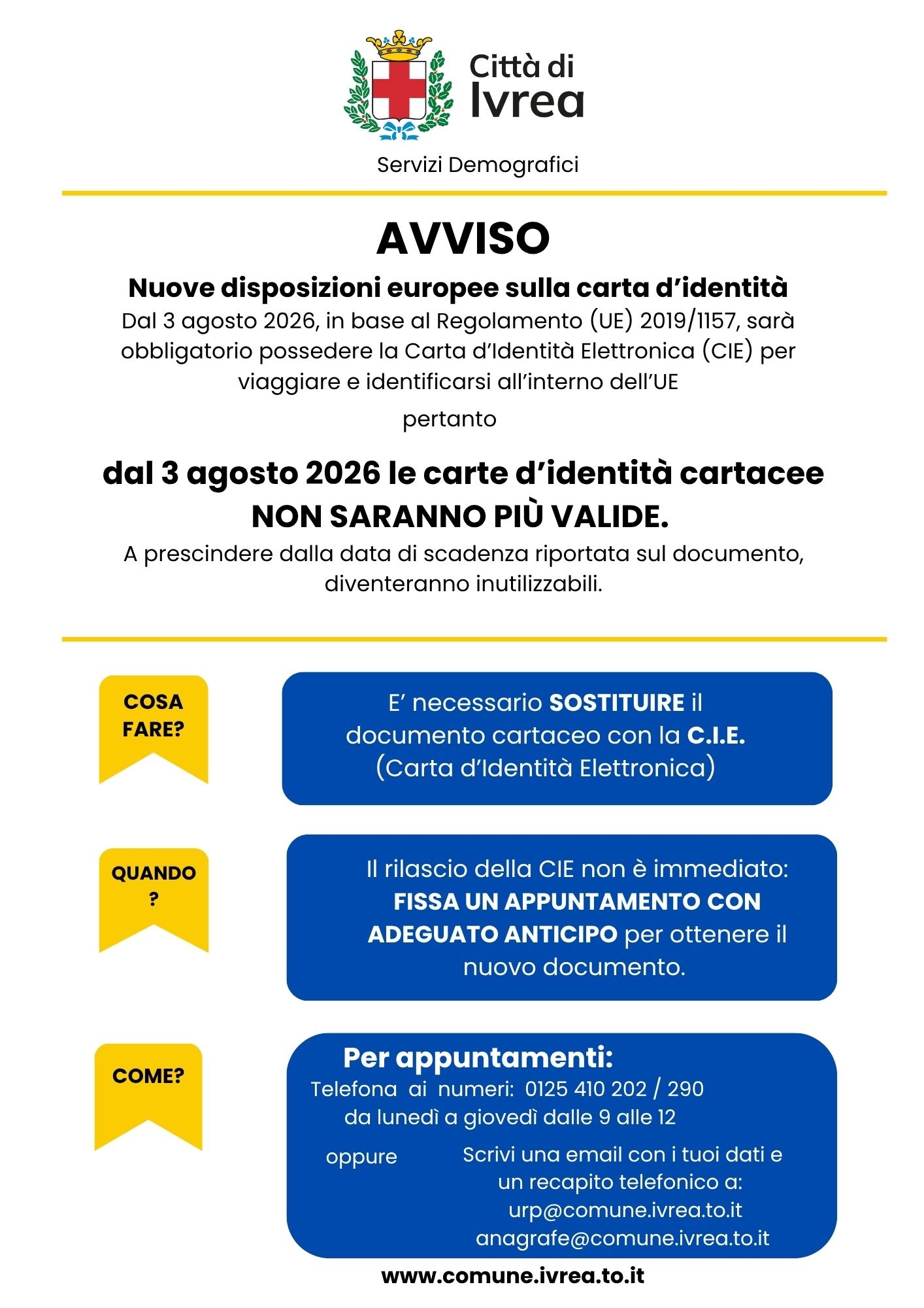 A prescindere dalla data di scadenza riportata sul documento diventeranno inutilizzabili: fissa un appuntamento con adeguato anticipo per ottenere la Carta d'identità Elettronica.
