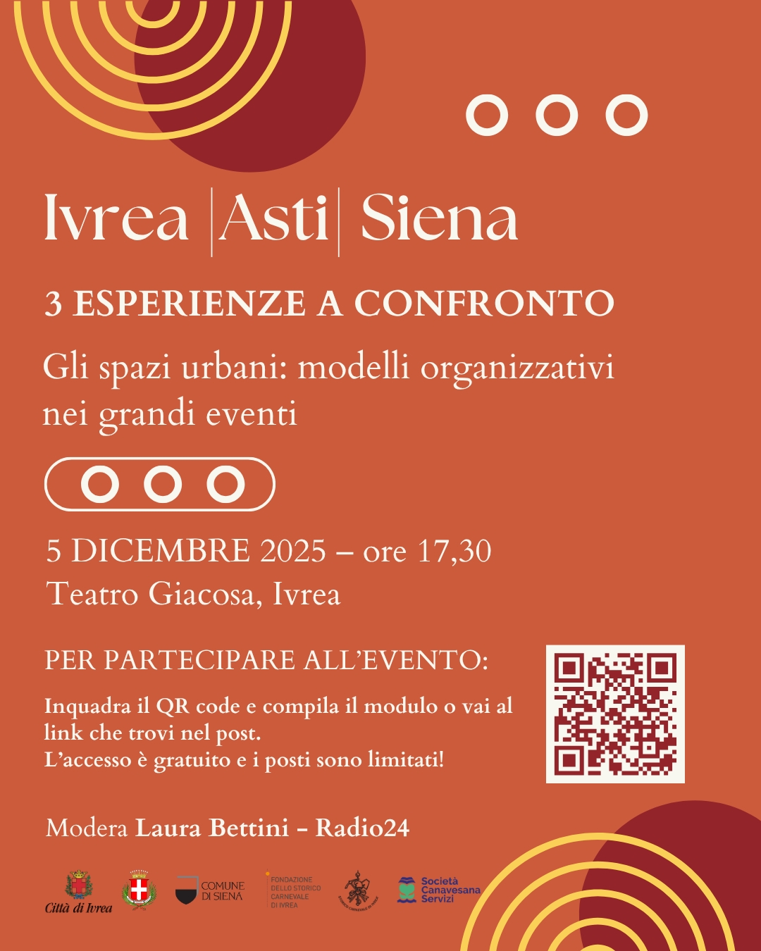 Ivrea ospiterà il 5 dicembre al Teatro Giacosa la prima edizione di un confronto nazionale tra città che organizzano grandi eventi urbani, con la partecipazione di Ivrea, Siena e Asti. L’incontro, condotto dalla giornalista di Radio24 Laura Bettini, metterà a confronto le esperienze dello Storico Carnevale di Ivrea, del Palio di Siena e del Palio di Asti, feste profondamente radicate nelle rispettive comunità e importanti per identità, partecipazione e coesione sociale.