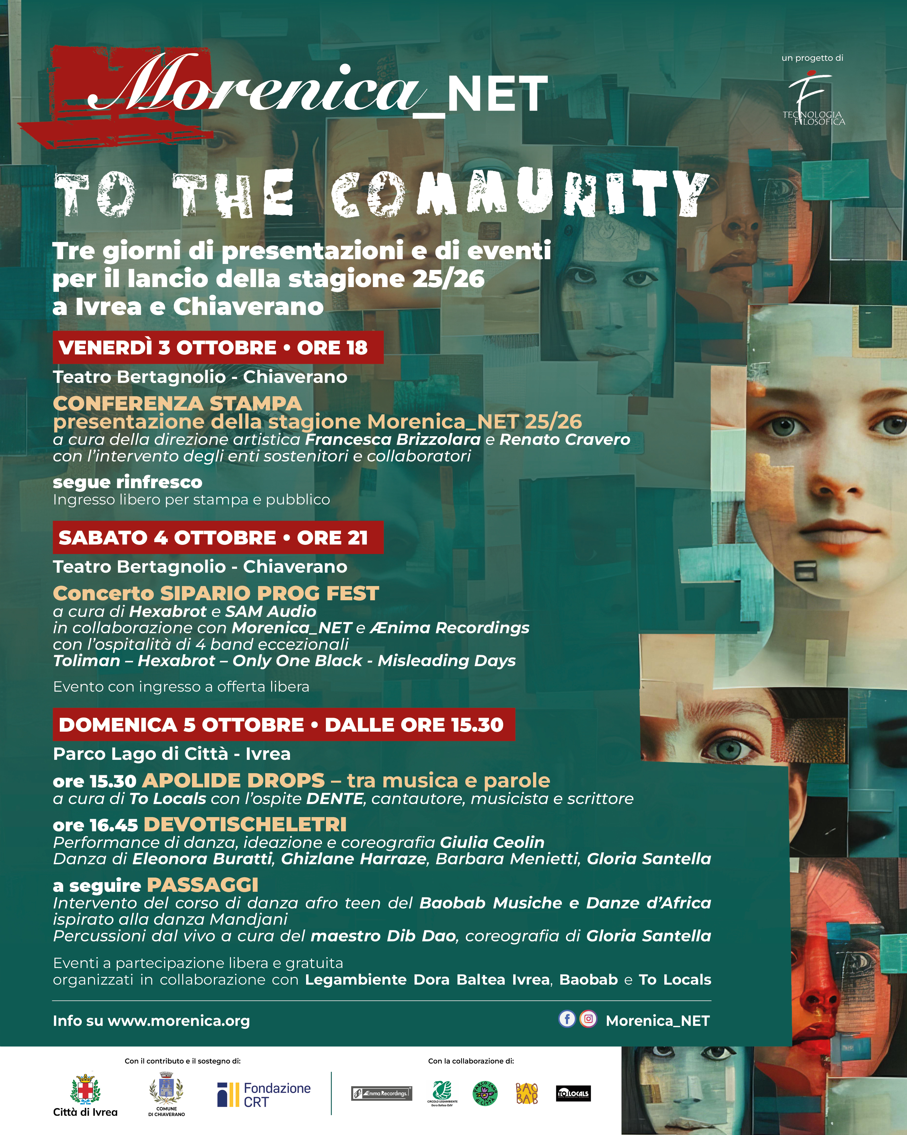 Tutto il programma di spettacoli della nuova stagione – dal 25 ottobre 2025 al 24 maggio 2026 – on line dal 3 ottobre, in seguito alla conferenza stampa di venerdì 3 ottobre ore 18 al Teatro Bertagnolio di Chiaverano a cura della direzione artistica Francesca Brizzolara e Renato Cravero con l’intervento degli enti sostenitori e collaboratori.