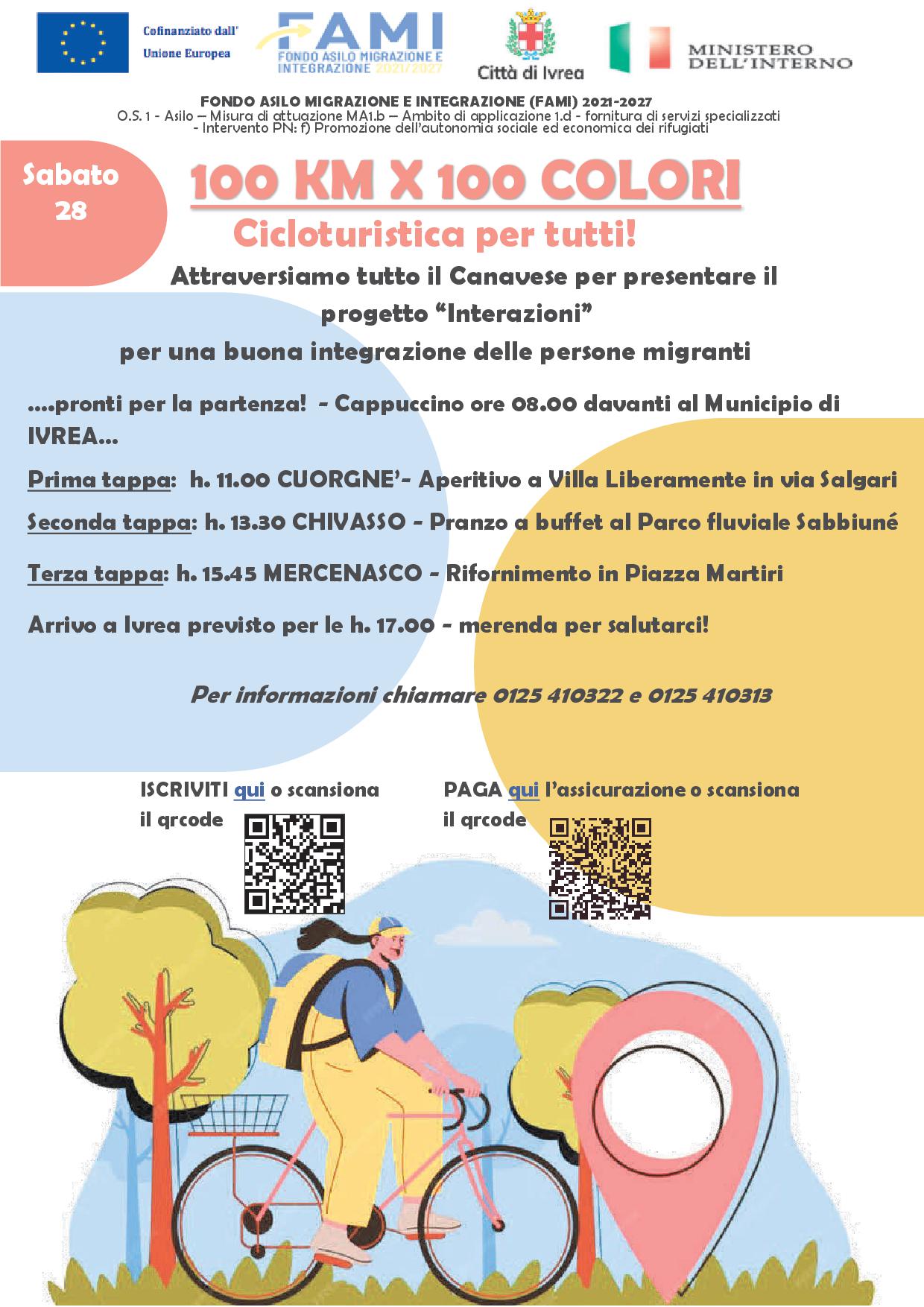 “100 km per 100 colori”: una carovana ciclistica a tappe aperta alla cittadinanza per raccontare e condividere il progetto Interazioni, che promuove percorsi di inclusione per le persone migranti, e finanziato dal Fondo Asilo, Migrazione e Integrazione (FAMI) 2021-2027 (O.S. 1 – Asilo – MA1.b – Ambito di applicazione 1.d – Intervento PN:f) con fondi comunitari e nazionali.