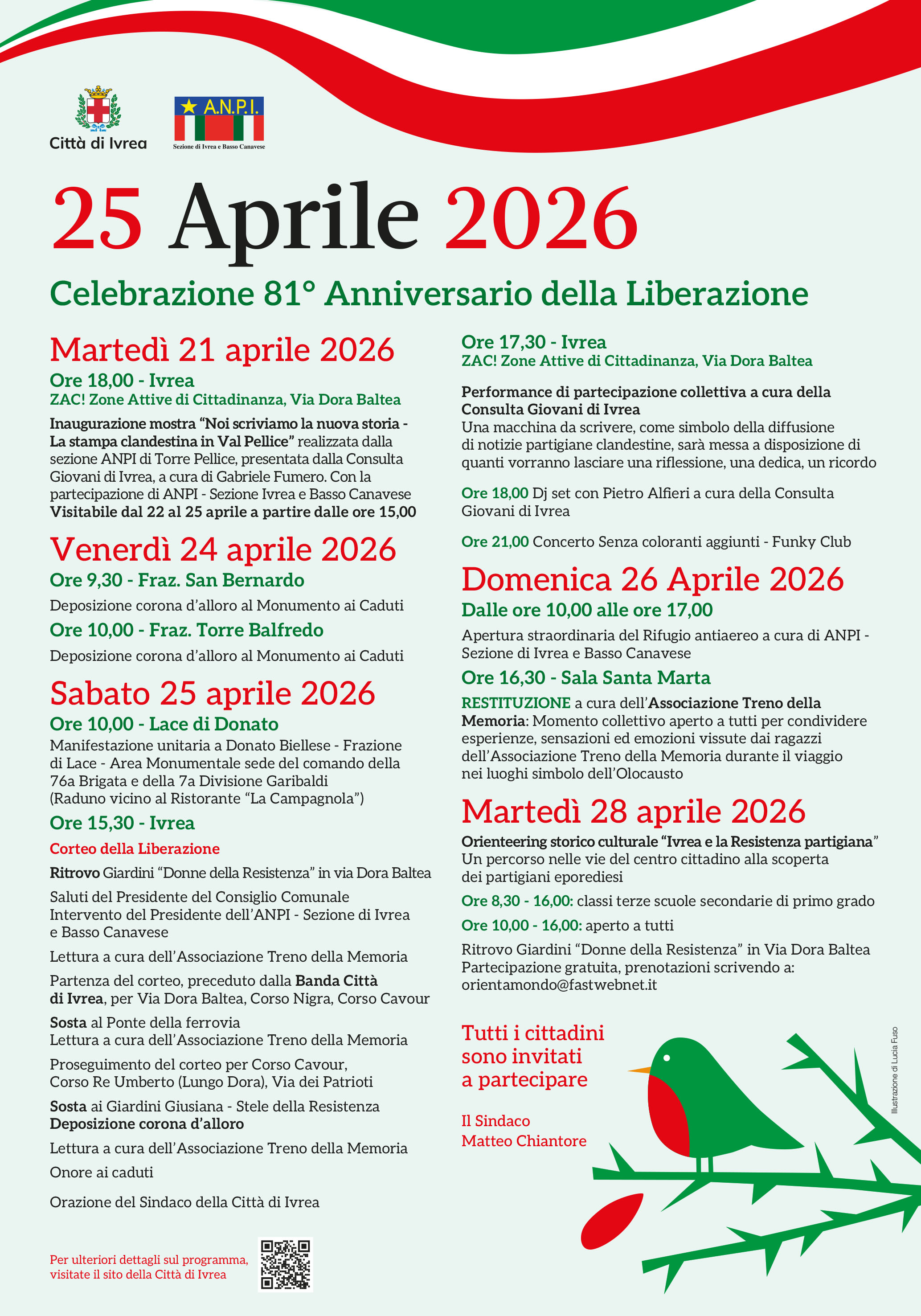 Il 25 Aprile rappresenta non solo una ricorrenza della memoria, ma un elemento fondante dell'identità civile, nel ricordo delle donne e degli uomini che scelsero la libertà, la democrazia e la dignità umana contro ogni forma di oppressione. Celebrare l’Anniversario della Liberazione significa guardare al futuro con consapevolezza, riaffermando i valori di libertà, giustizia e solidarietà come fondamento della nostra comunità.