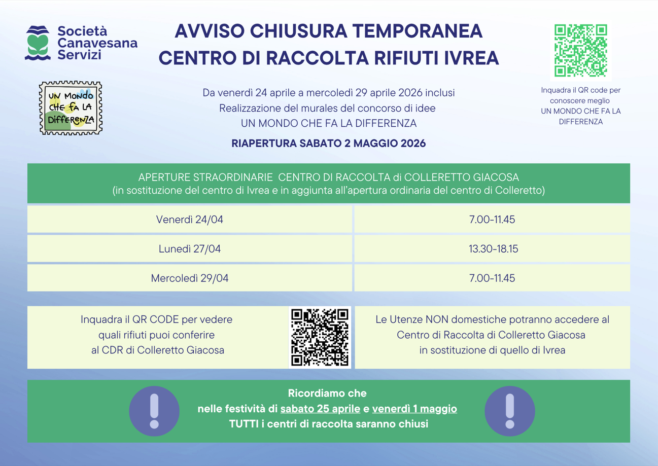 da venerdì 24 a mercoledì 29 aprile 2026 compresi il Centro di raccolta di Ivrea chiuderà al pubblico; le aperture verranno ripristinate regolarmente da sabato 2 maggio 2026.