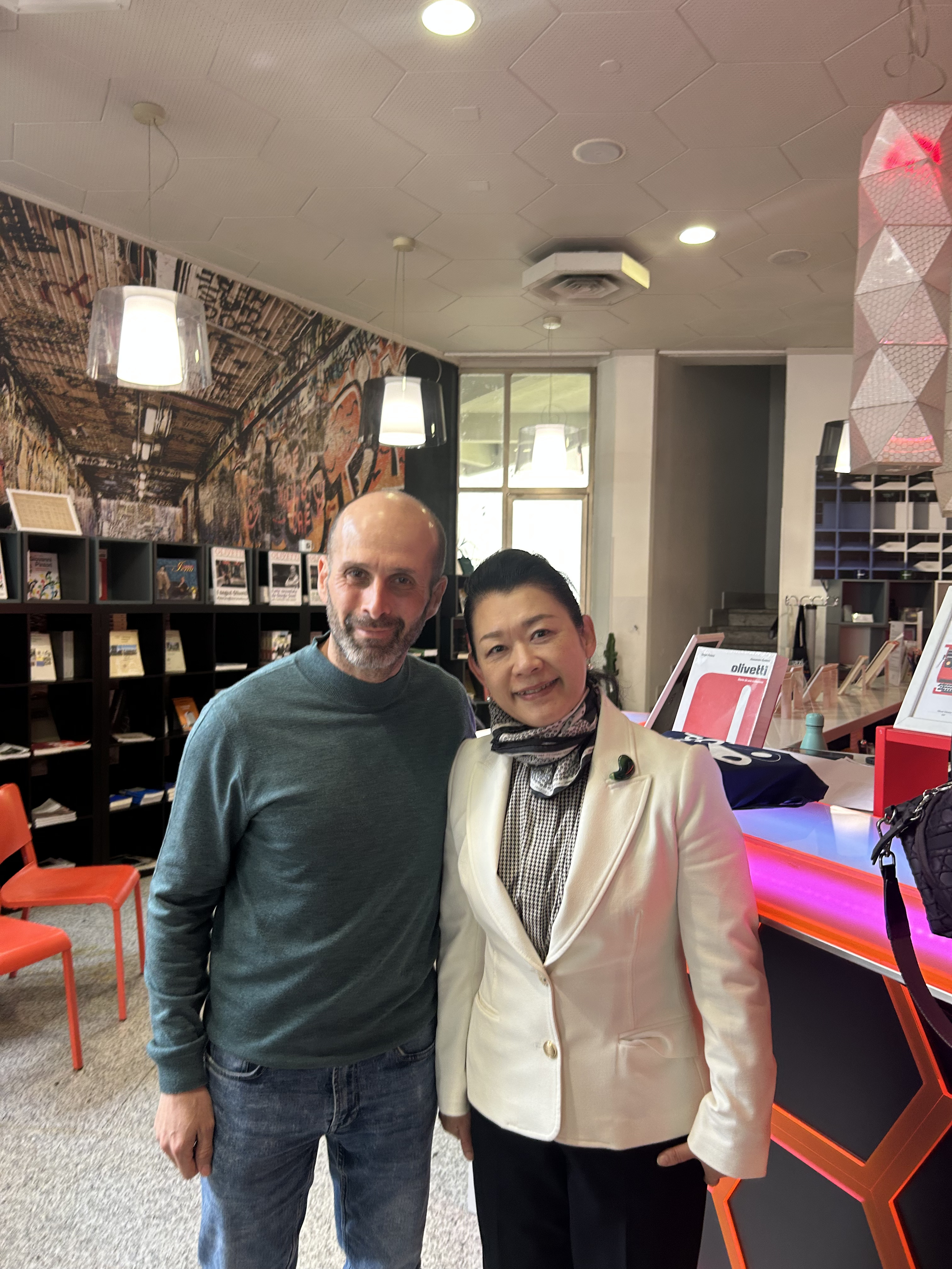 Il cuore operativo della visita si è poi spostato sul tema dell'accoglienza turistica: il confronto tra l’attuale Visitor Centre e il cantiere del nuovo centro visitatori ha permesso di illustrare l’evoluzione dei servizi di orientamento, mentre la visita presso l’Associazione Archivio Storico Olivetti ha offerto una prospettiva profonda sulla genesi storica dell’iscrizione del sito di Ivrea nella lista del Patrimonio Mondiale. L’occasione è stata preziosa anche per condividere con l’ospite, tra le altre cose, le testimonianze delle architetture e dei progetti sviluppati nel tempo da Olivetti Japan.