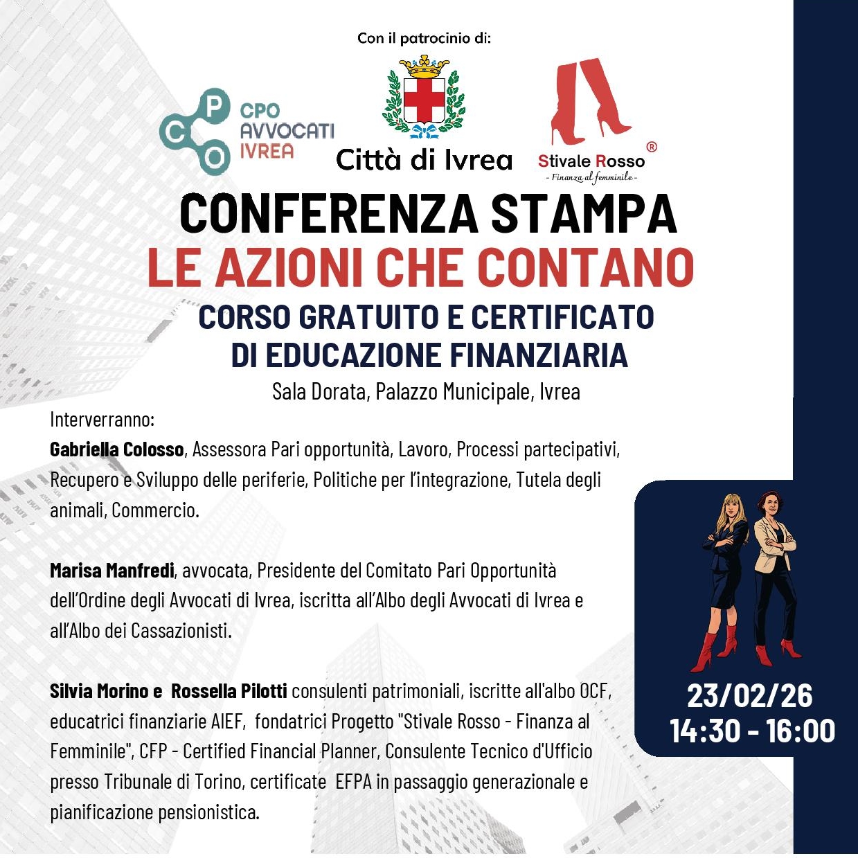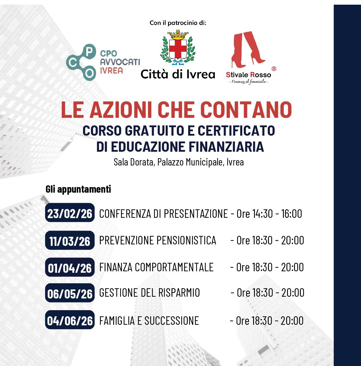 Tali corsi di educazione finanziaria sono promossi dalla Città di Ivrea e dal Comitato Pari Opportunità dell’Ordine degli Avvocati di Ivrea, e tenuto da Stivale Rosso - Finanza al Femminile. L’iniziativa nasce per offrire alle persone, e in particolare alle donne, strumenti concreti per gestire il proprio patrimonio, acquisire conoscenze e competenze per assumere decisioni consapevoli in ambito lavorativo, sulle questione economiche e pianificare il futuro con serenità.