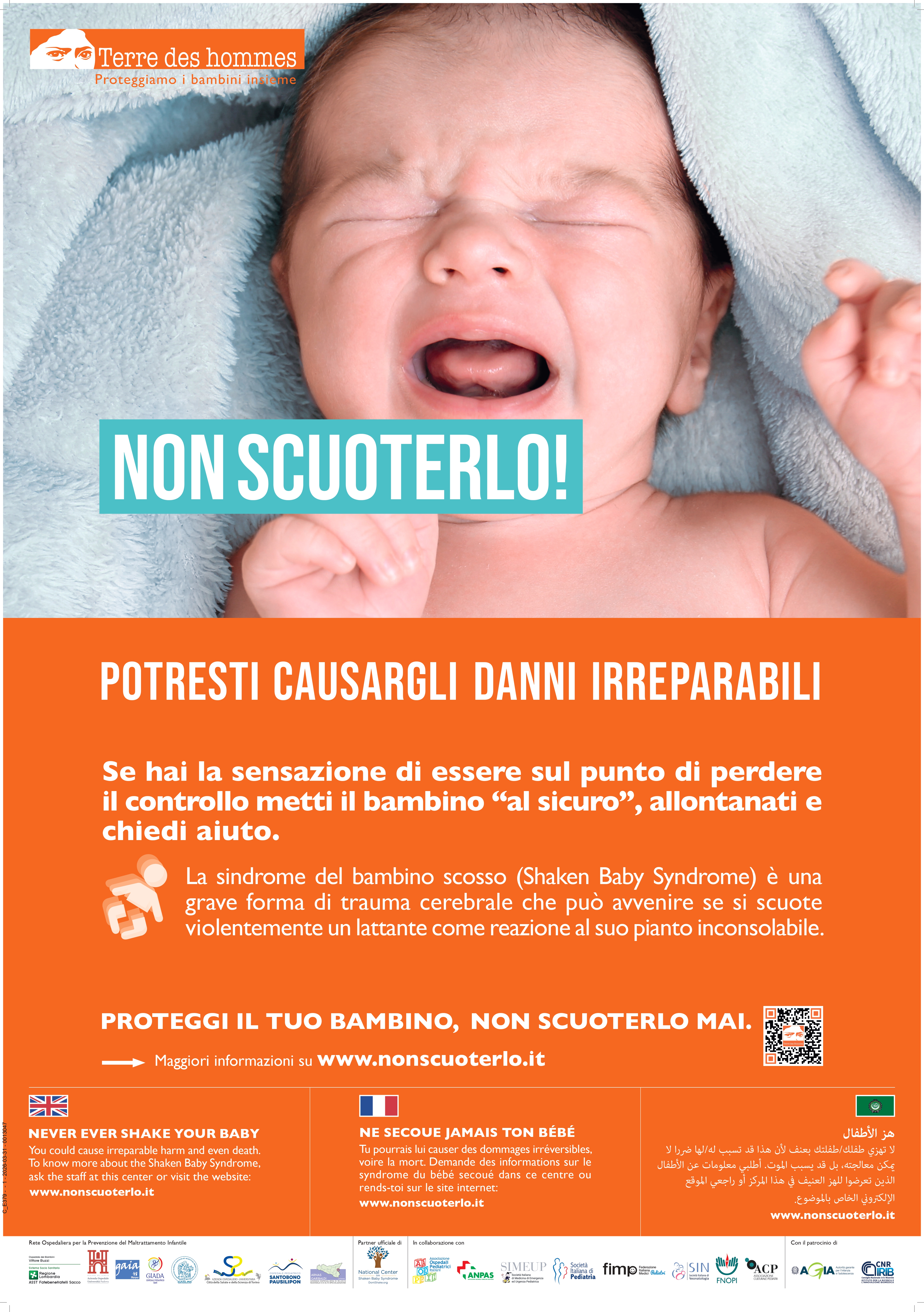 La campagna “Nonscuoterlo!” è nata nel 2017 dalla collaborazione tra la Fondazione Terre des Hommes e una rete di otto ospedali specializzati nella prevenzione e cura del maltrattamento infantile; oggi è sostenuta da una solida e autorevole rete di alleanze con il mondo della salute pubblica e della comunità scientifica.